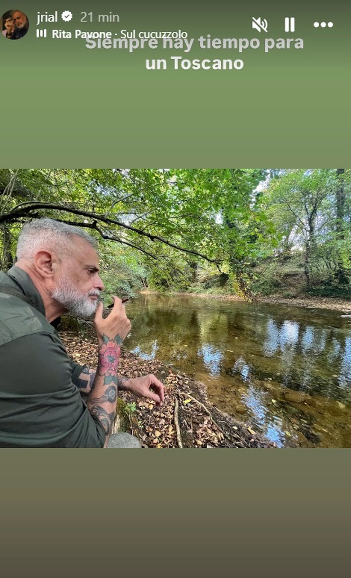 "Recargando energía para lo que se viene. Siempre hay tiempo para un toscano", indicó Jorge Rial en un momento de total relax fumando un habano frente a un río y donde se mostró también andando en bicicleta en un campo disfrutando del sol radiante.