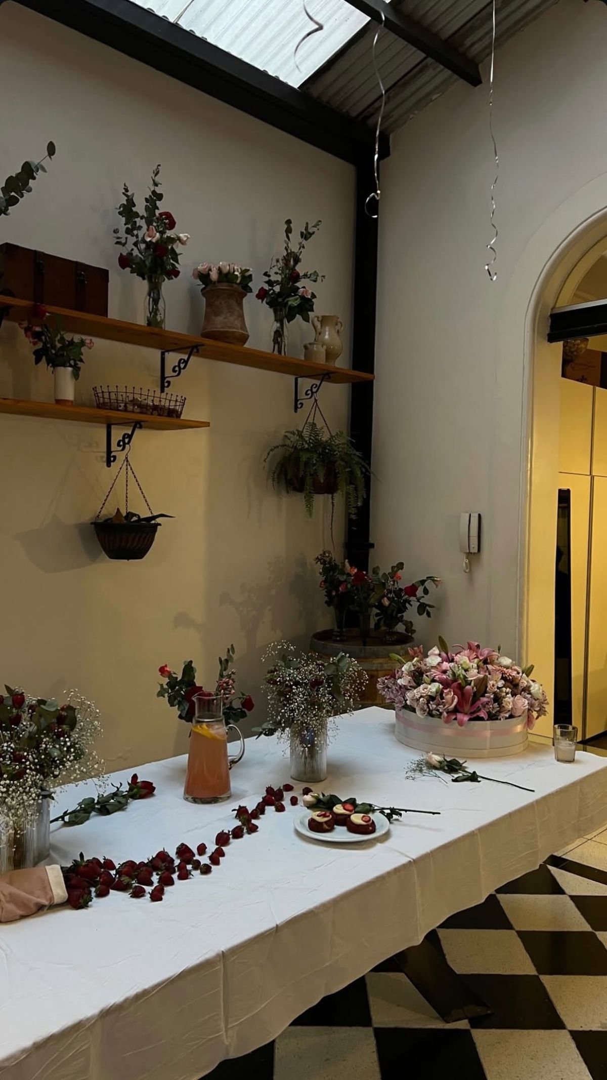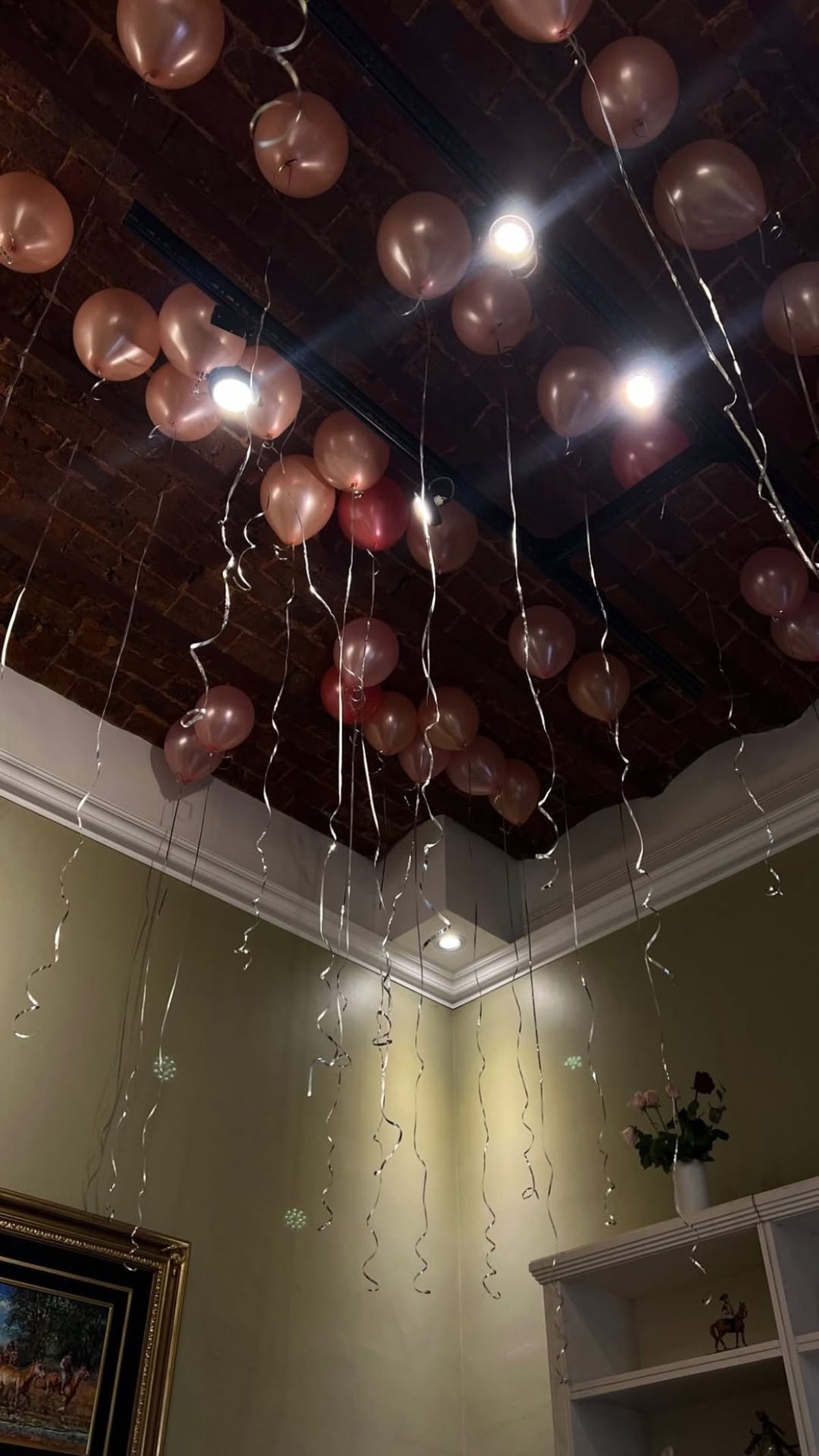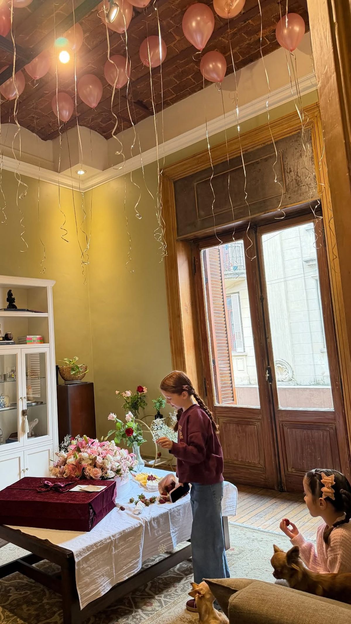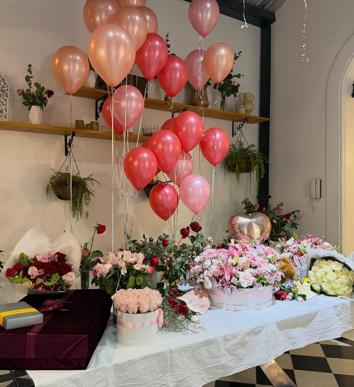 El espacio también se vistió de celebración con globos metalizados en tonos rosa y dorado que colgaban del techo, mientras que globos rojos en forma de corazón decoraban la escalera de madera, aportando un toque festivo y delicado.
