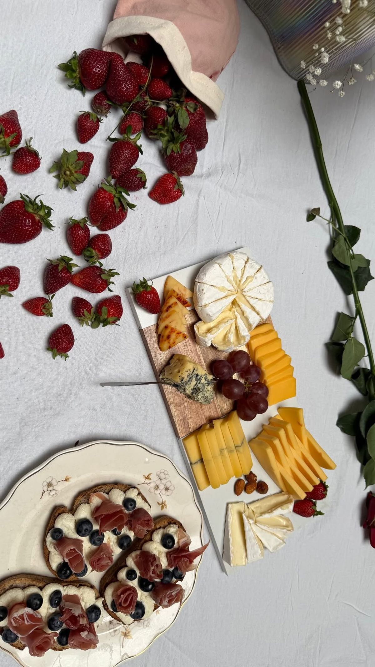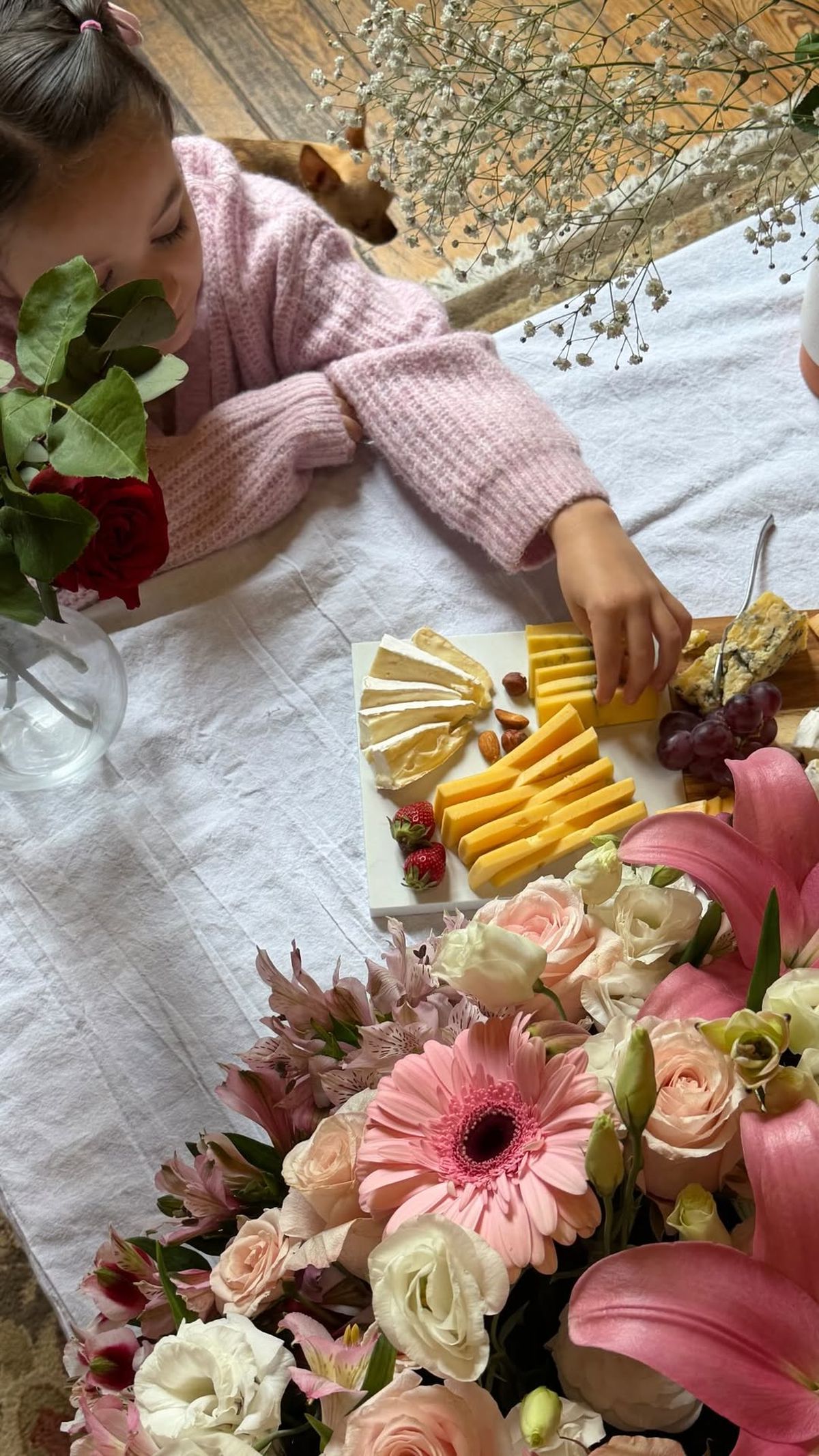 La artista, participante de MasterChef Celebrity (Telefe), decoró la mesa con un estilo romántico: flores en abundancia, una elegante tabla de quesos, frutillas frescas y postres.