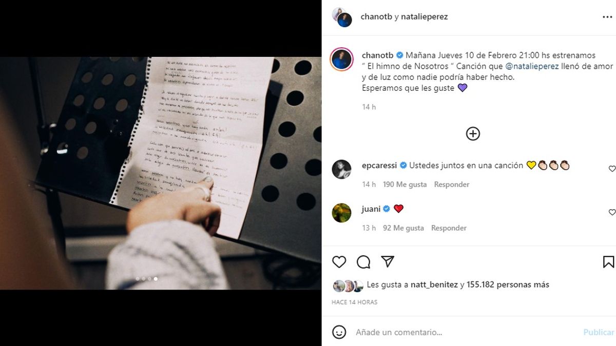 Lo cierto es que desde las redes, Natalie Pérez y Chano sorprendieron al encontrarse y dar un anuncio en conjunto: el estreno de la canción "El himno de nosotros". "Canción que llenó de amor y de luz como nadie podría haber hecho", expresó el ex Tan Biónica en su posteo junto a las imágenes junto a su colega. El corte musical se estrena este mismo jueves por la noche.