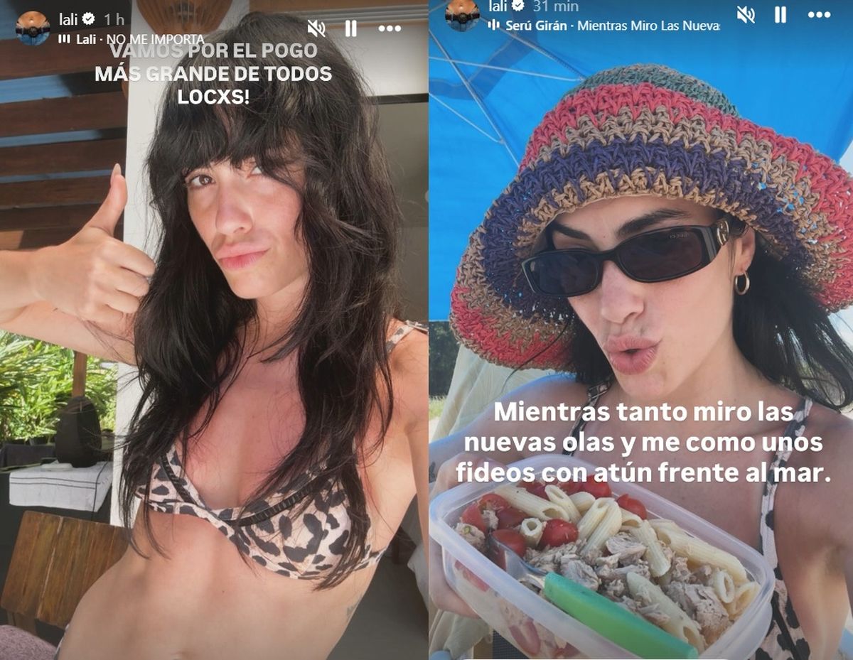 "Mientras tanto miro las nuevas olas y me como unos fideos con atún frente al mar", agregó divertida Lali en otra historia donde se la ve en la playa con un tupper con su comida preparada.