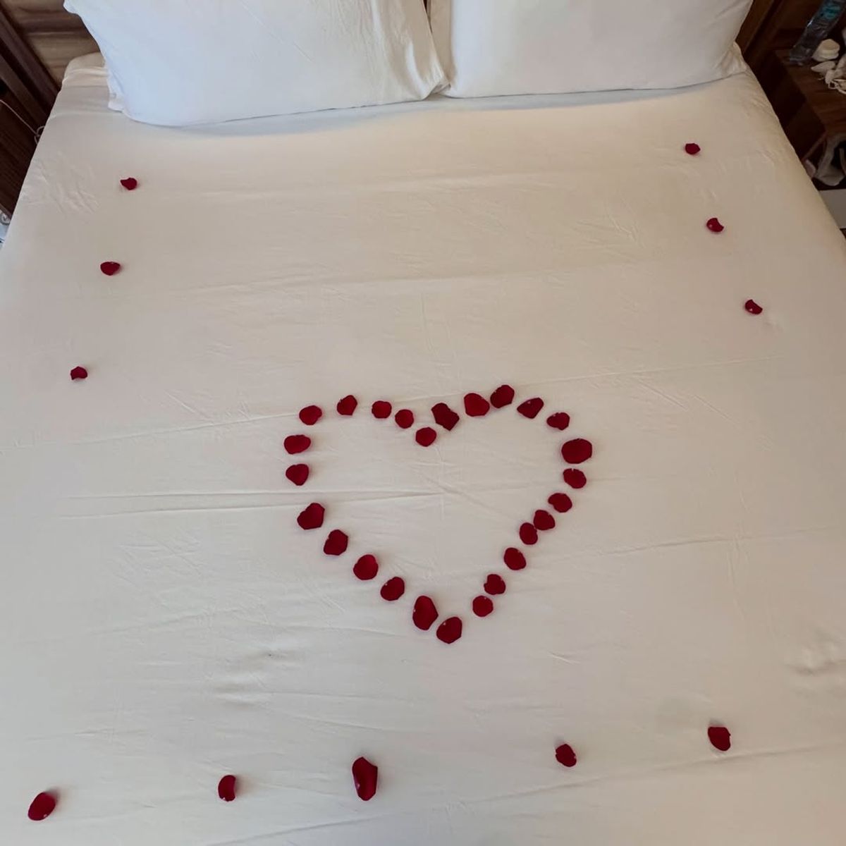 Las imágenes que Borghi publicó parecen reforzar la versión de la usuaria. Aunque en la mayoría aparece sola, hay gestos que sugieren compañía: una foto en la que disfruta de una copa de vino, claramente tomada por alguien más, y otra que muestra una cama decorada con pétalos de rosa formando un corazón. Detalles que hablan de un viaje con tintes románticos.