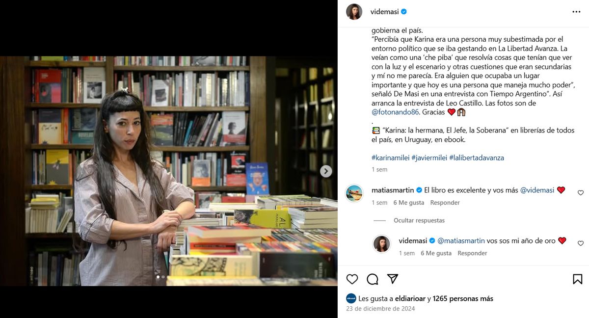 Días atrás, el comunicador le había comentado a su novia en una publicación sobre el reciente libro que lanzó, “Karina: la hermana, el jefe, la soberana": “El libro es excelente, y vos más”. A lo que ella le respondió: “Vos sos mi año de oro”.