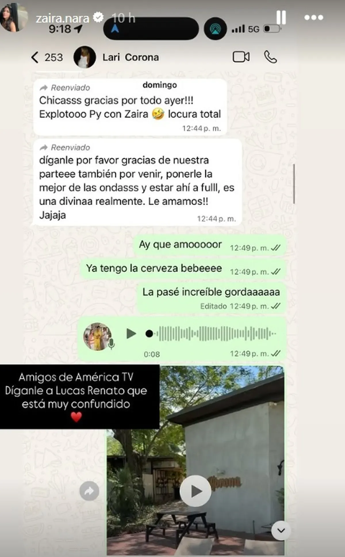 Al mostrar la prueba para contrarrestar esa versión que circuló en la televisión de ese país, la modelo agregó un tanto molesta: "Amigos de América TV, díganle a Lucas Renatto que está muy confundido".