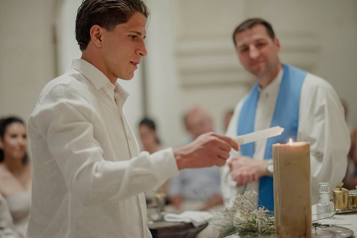 Todos los invitados, tanto amigos como familiares, optaron por una vestimenta en tonos claros, con telas livianas y cortes simples. Eva eligió un vestido camisero de lino en color nude, con delicados detalles de encaje, ideal para un look romántico y sutil. El modelo, largo hasta los tobillos, incorporó un lazo en la cintura que realzó la silueta sin resignar comodidad ni frescura. Completó el look con sandalias bajas estilo romano en color tostado, cómodas y con onda.
