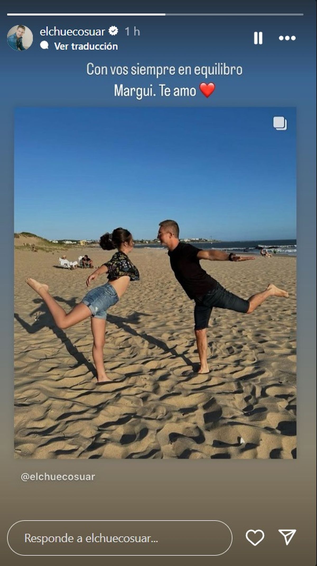 "Con vos siempre en equilibro Margui. Te amo", precisó a puro sentimiento el Chueco junto al emoji de un corazón con una serie de imágenes junto a su hija en la arena de una playa que lucía con muy poca gente alrededor y hasta se animaron a dar un paso de baile con sus piernas elevadas.