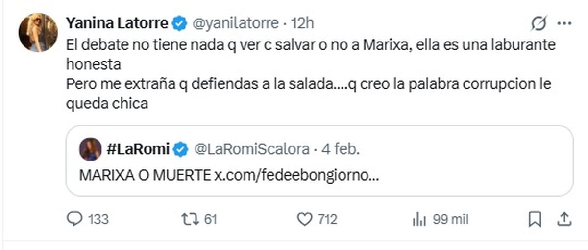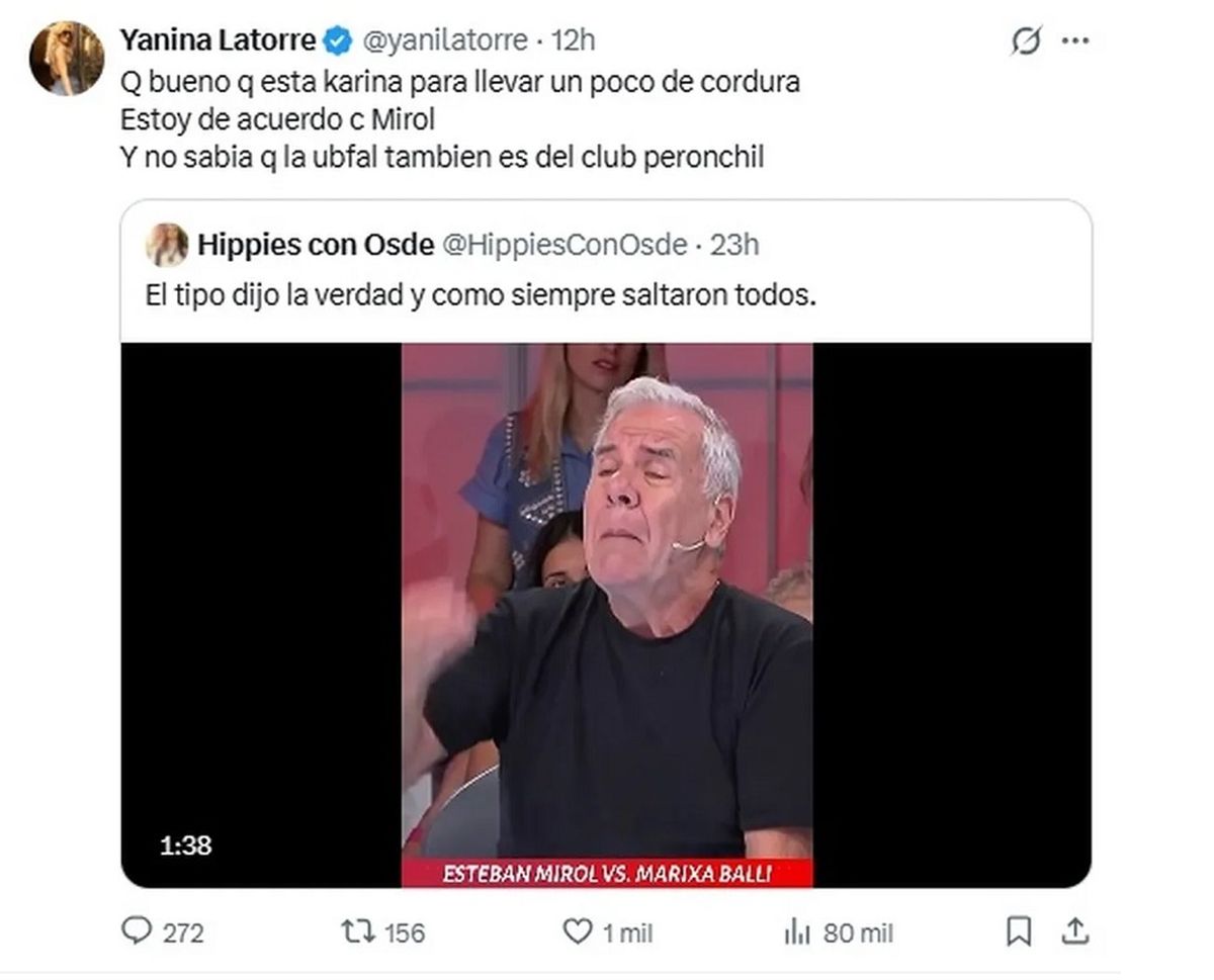 “Qué bueno que está Karina (Iavícoli) para llevar un poco de cordura. Estoy de acuerdo con Mirol y no sabía que la Ubfal también es del club peronchil”, escribió picante avivando aún más la interna y anticipando un clima caliente a su regreso al aire.