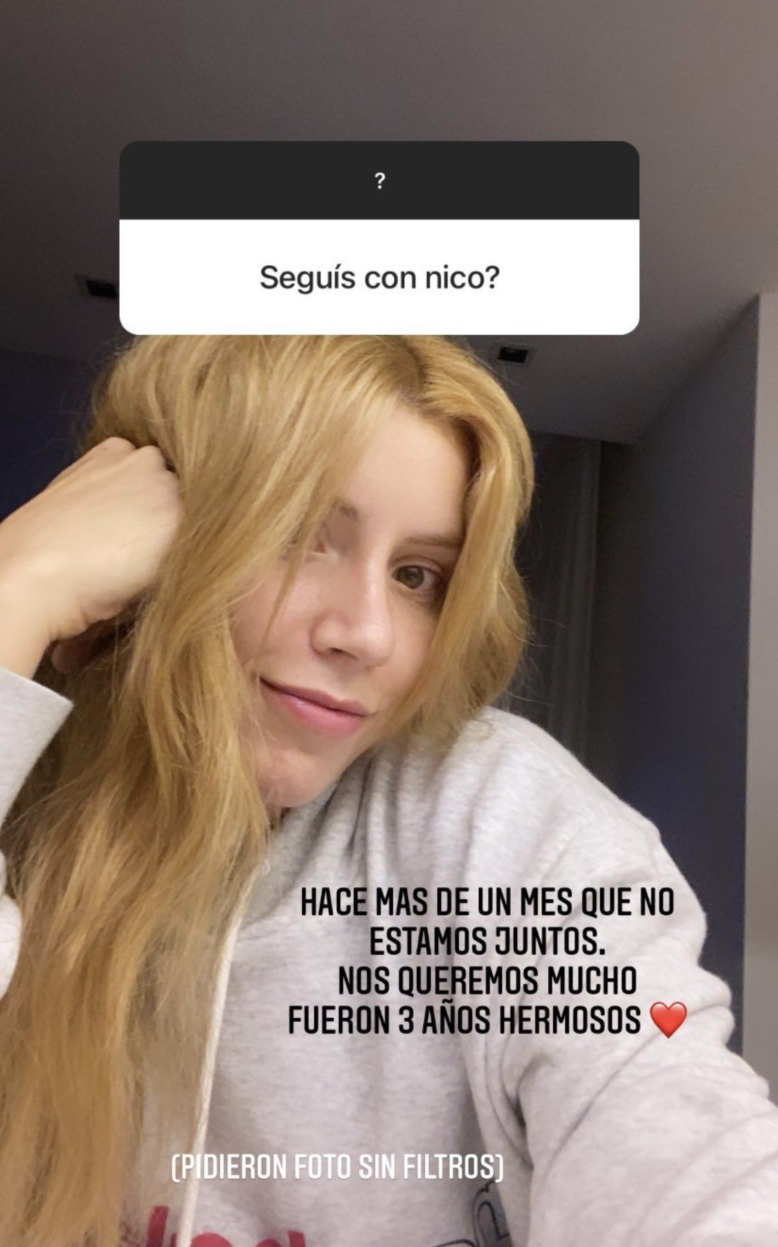 Uno de sus seguidores le preguntó si seguía en pareja con Cabré. Y ella respondió de manera contundente: “Hace un mes que no estamos juntos. Nos queremos mucho, fueron tres años hermosos”, fue la frase con la que recordó la relación.