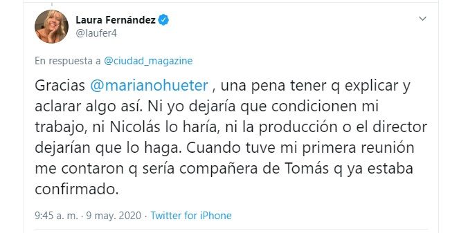 "Gracias @marianohueter, una pena tener que explicar y aclarar algo así. Ni yo dejaría que condicionen mi trabajo, ni Nicolás lo haría, ni la producción o el director dejarían que lo haga", indicó contundente.