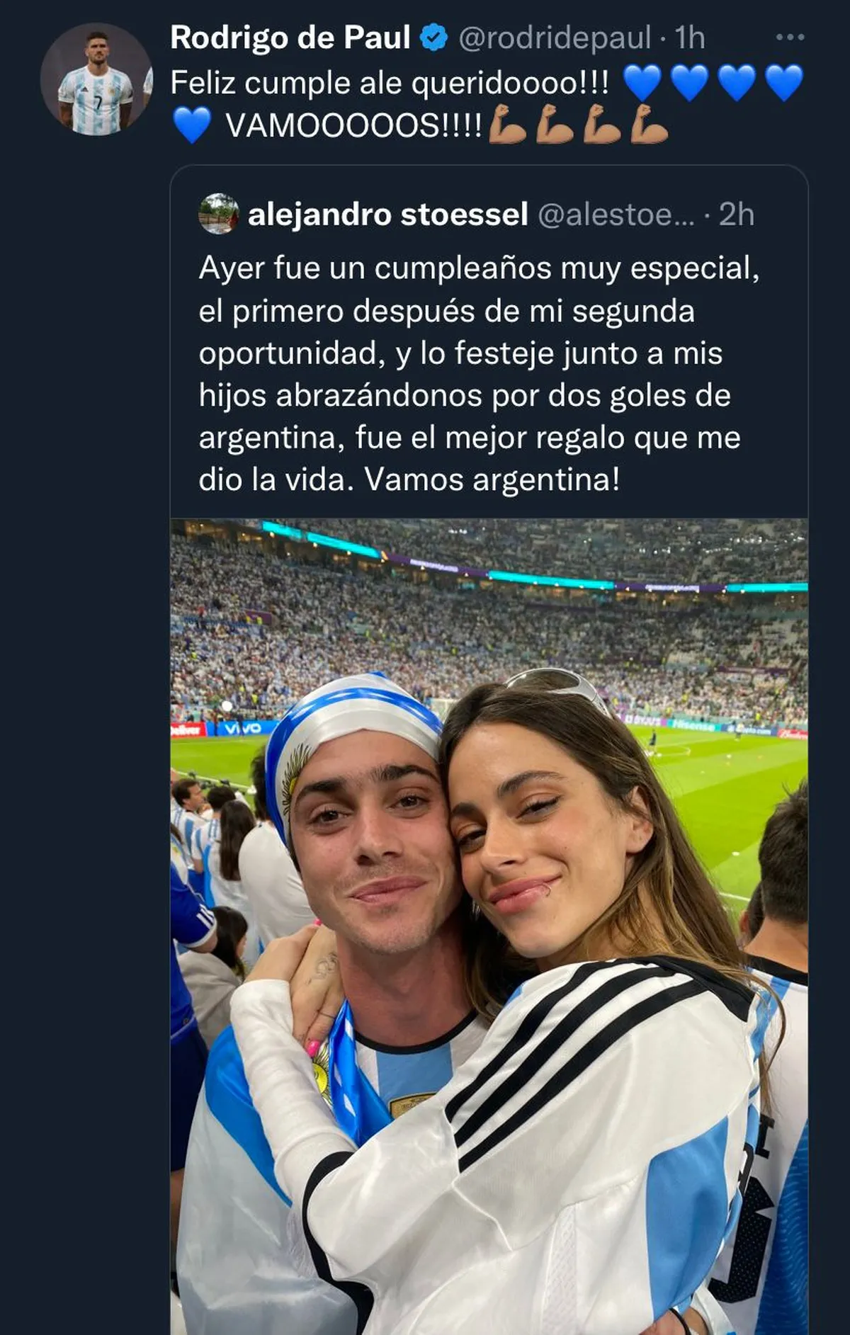 "Ayer fue un cumpleaños muy especial, el primero después de mi segunda oportunidad, y lo festeje junto a mis hijos abrazándonos por dos goles de argentina, fue el mejor regalo que me dio la vida. Vamos argentina!", escribió Alejandro este domingo en Twitter. A los pocos minutos, De Paul le comentó: "Feliz cumple ale queridoooo!!! VAMOOOOOS!!!!".
