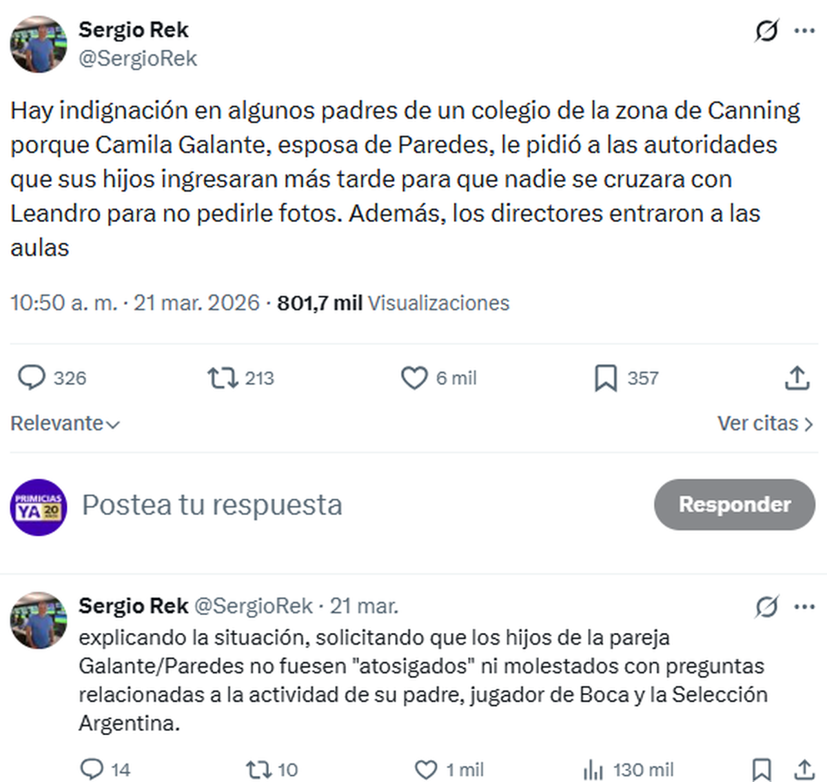 En su cuenta de X, Sergio Rek, escribió: "Hay indignación en algunos padres de un colegio de la zona de Canning porque Camila Galante, esposa de Paredes, le pidió a las autoridades que sus hijos ingresaran más tarde para que nadie se cruzara con Leandro para no pedirle fotos".