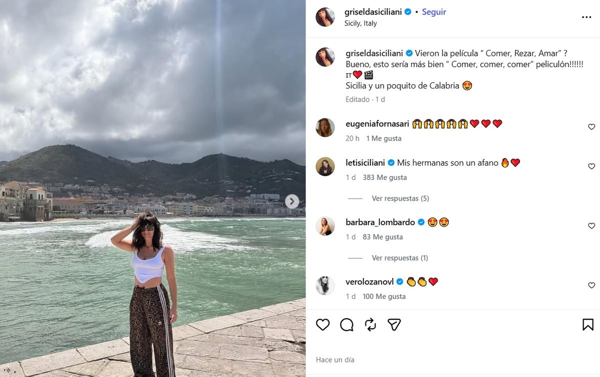 "¿Vieron la película 'comer, rezar, amar'? Bueno, esto sería más bien 'comer, comer, comer', peliculón! Sicilia y un poquito de Calabria", reflexionó con mucho humor la actriz en un posteo con una serie de imágenes de lo que significó el especial viaje junto a una de sus hermanas.