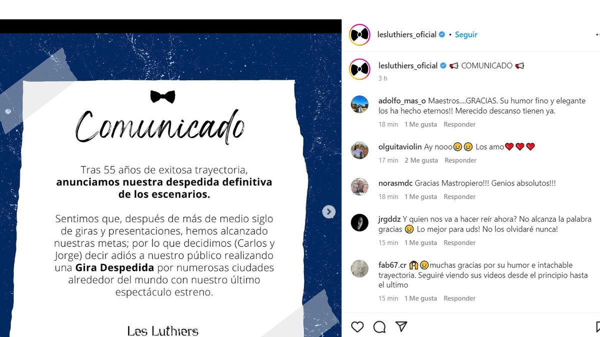 Tras 55 años de exitosa trayectoria, el conjunto humorístico-musical Les Luthiers anuncia su despedida definitiva de los escenarios. El grupo nació en 1967 y ha conservado desde entonces su espíritu inquieto, humorístico y crítico.