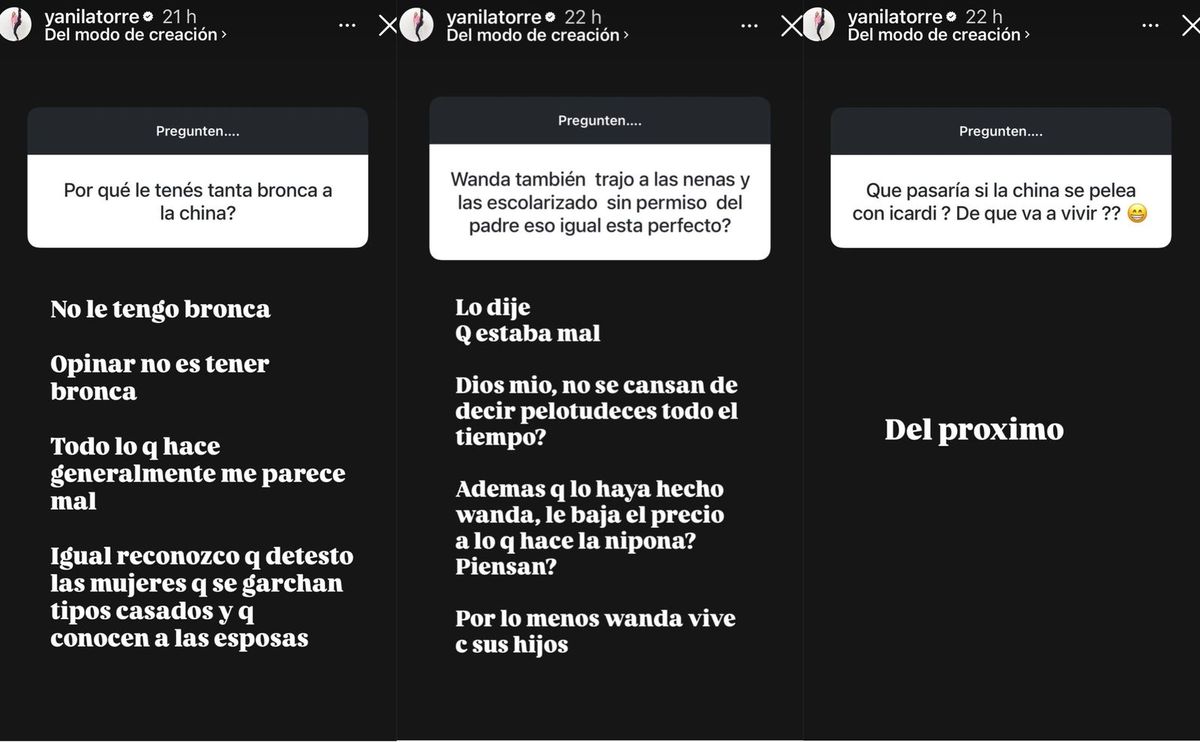Así, en una nueva interacción con la comunidad virtual, Yanina fue clara cuando le preguntaron por qué le tiene tanta bronca a la China. "Yo no le tengo bronca. Opinar no es tener bronca. Todo lo que hace, generalmente, me parece mal", aseguró.