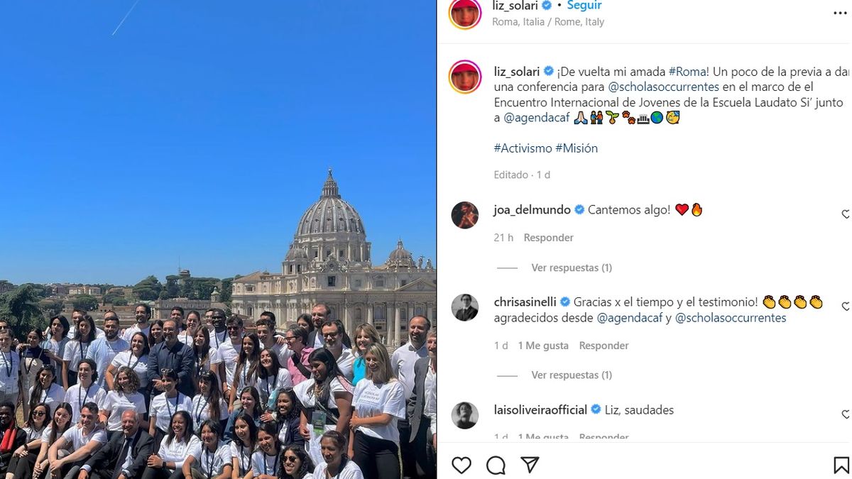 "¡De vuelta mi amada #Roma! Un poco de la previa a dar una conferencia para @scholasoccurrentes en el marco de el Encuentro Internacional de Jóvenes de la Escuela Laudato Si", señalaba la rubia, quien en 2018 se casó con el empresario italiano Walter Fara, antes de la conferencia.
