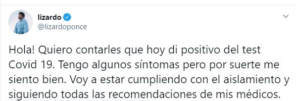 "Hola! Quiero contarles que hoy di positivo del test Covid 19. Tengo algunos síntomas pero por suerte me siento bien. Voy a estar cumpliendo con el aislamiento y siguiendo todas las recomendaciones de mis médicos", señaló Lizardo.