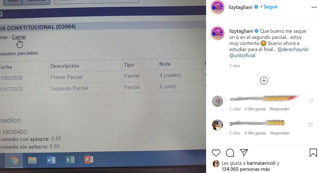 “Que bueno me saque un 6 en el segundo parcial... estoy muy contenta, bueno ahora a estudiar para el final…”, escribió Lizy ya más confiada que le irá bien en el final de la materia.
