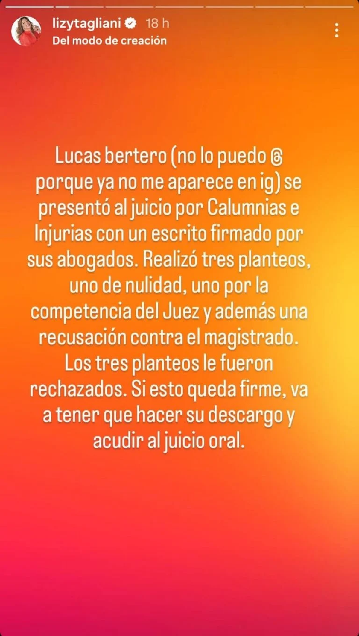 A través de su cuenta de Instagram, Lizy confirmó este 9 de octubre que Bertero se presentó mediante un escrito y no de manera presencial: “Lucas Bertero (no lo puedo @ porque ya no me aparece en Instagram) se presentó al juicio por Calumnias e Injurias con un escrito firmado por sus abogados”.