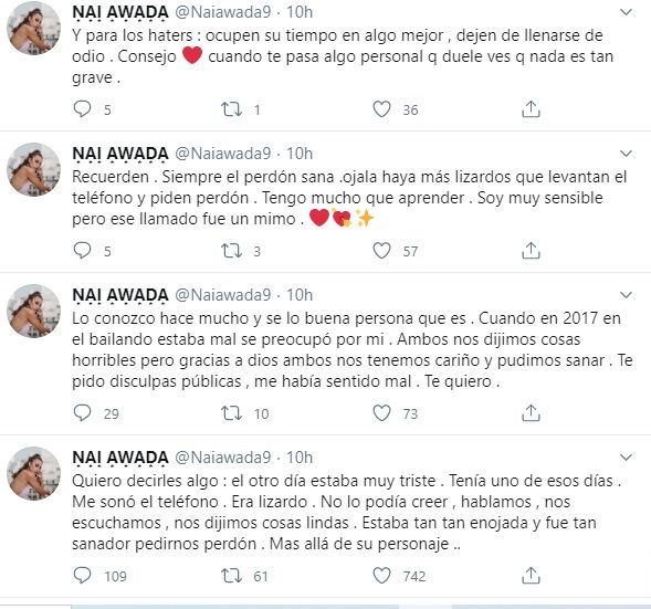 "Quiero decirles algo: el otro día estaba muy triste. Tenía uno de esos días. Me sonó el teléfono. Era lizardo. No lo podía creer, hablamos, nos escuchamos, nos dijimos cosas lindas. Estaba tan tan enojada y fue tan sanador pedirnos perdón", indicó Nai desde Twitter.