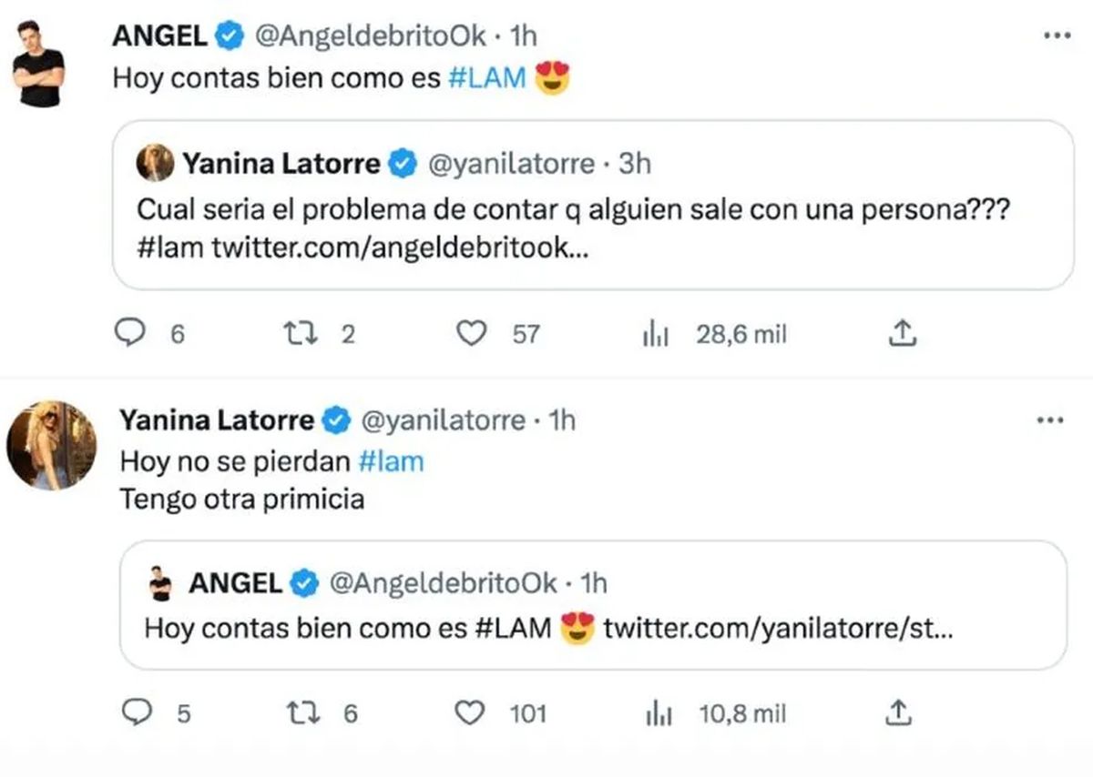"¿Cuál sería el problema de contar que alguien sale con una persona?", acotó Yanina Latorre en otra publicación. "Hoy contás bien cómo es #LAM", agregó el periodista. "Hoy no se pierdan #LAM. Tengo otra primicia", prometió la angelita.