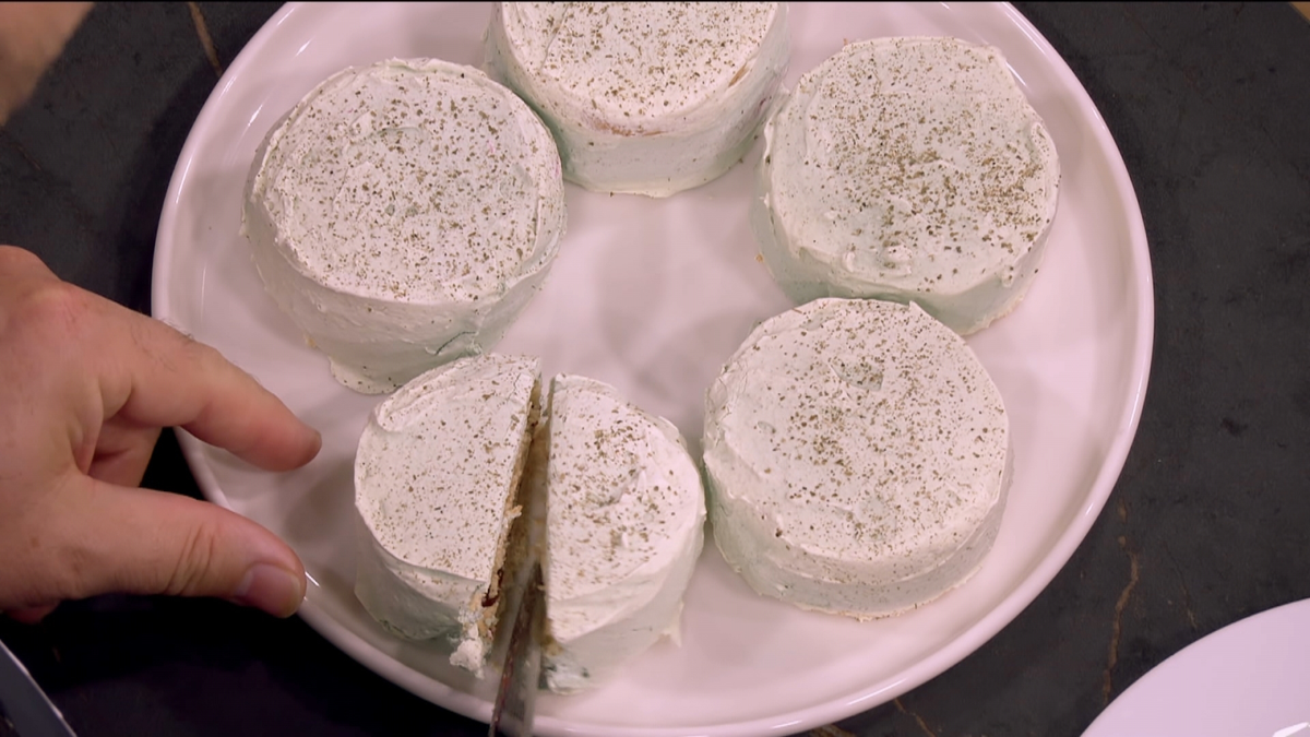 Por último, Miguel Ángel Rodríguez observó los patagónicos, decorados con frambuesas liofilizadas. Sobre su estructura, el pastelero explicó: “Es una proporción igual de masa, relleno y masa, es como una bandera”.