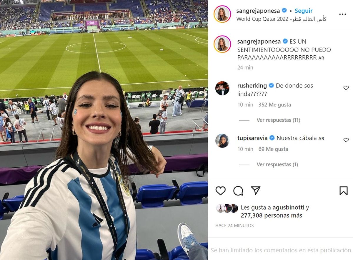 "Por suerte no estaba para nada tensa antes de que comience el partido", bromeó la China al repostear la foto, notablemente movilizada por el encuentro deportivo.