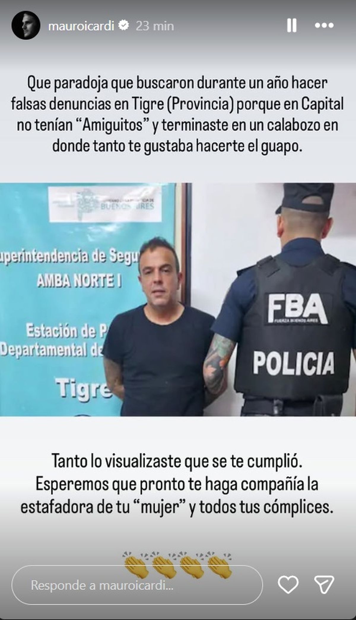 Luego, ante la imagen del abogado Nicolás Payarola esposado, Mauro Icardi recordó: "Qué paradoja que buscaron durante un año hacer falsas denuncias en Tigre (Provincia) porque en Capital no tenían ‘amiguitos’ y terminaste en un calabozo en donde tanto te gustaba hacerte el guapo".