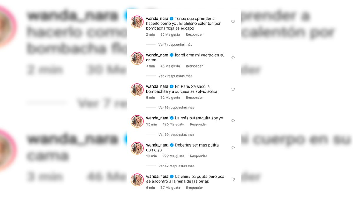 "Tenés que aprender a hacerlo como yo. El chileno calentón por bombacha floja se escapó", "Icardi ama mi cuerpo en su cama", "En París, se sacó la bombachita y a su casa se volvió solita" La más putaraquita soy yo", "Deberías ser más putita como yo", "La China es putita, pero acá se encontró a la reina de las putas", fueron algunos de los comentarios de Wanda.