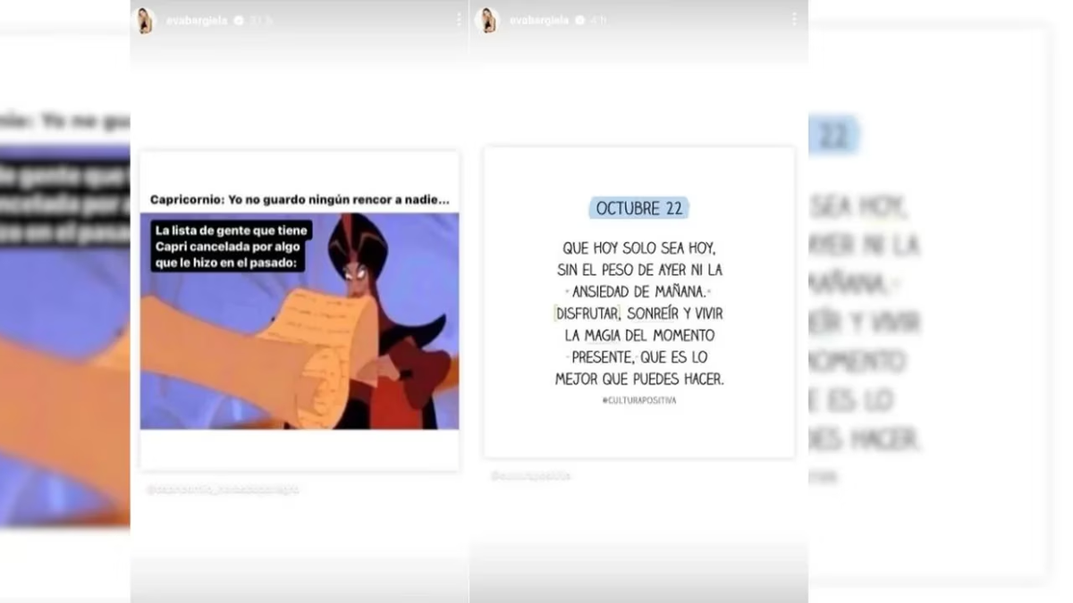 Finalmente, en otra publicación, Eva dejó una profunda reflexión, más que sugestiva. “Octubre 22. Que hoy solo sea hoy, sin el peso de ayer ni la ansiedad de mañana. Disfrutar, sonreír y vivir la magia del momento presente, que es lo mejor que puedes hacer”, escribió.