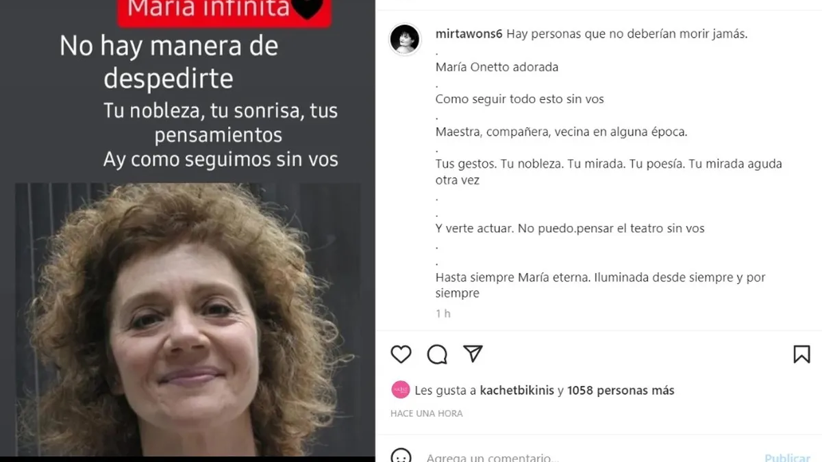 "Hasta siempre, María eterna. Iluminada desde siempre y por siempre", cerró Wons. Y compartió una foto de María Onetto, a la que le agregó también un texto sobre la imagen. "María infinita. No hay manera de despedirte. Tu nobleza, tu sonrisa, tus pensamientos. Ay cómo seguimos sin vos", concluyó la actriz, notablemente conmovida.
