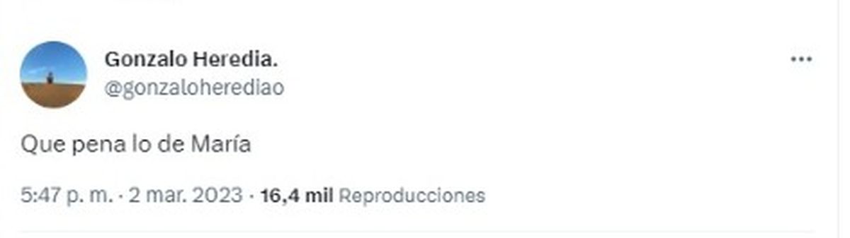 Por su parte, Gonzalo Heredia se limitó a escribir con tristeza: “Qué pena lo de María”, y Jorgelina Aruzzi compartió la noticia en sus historias de Instagram con una foto de la actriz.
