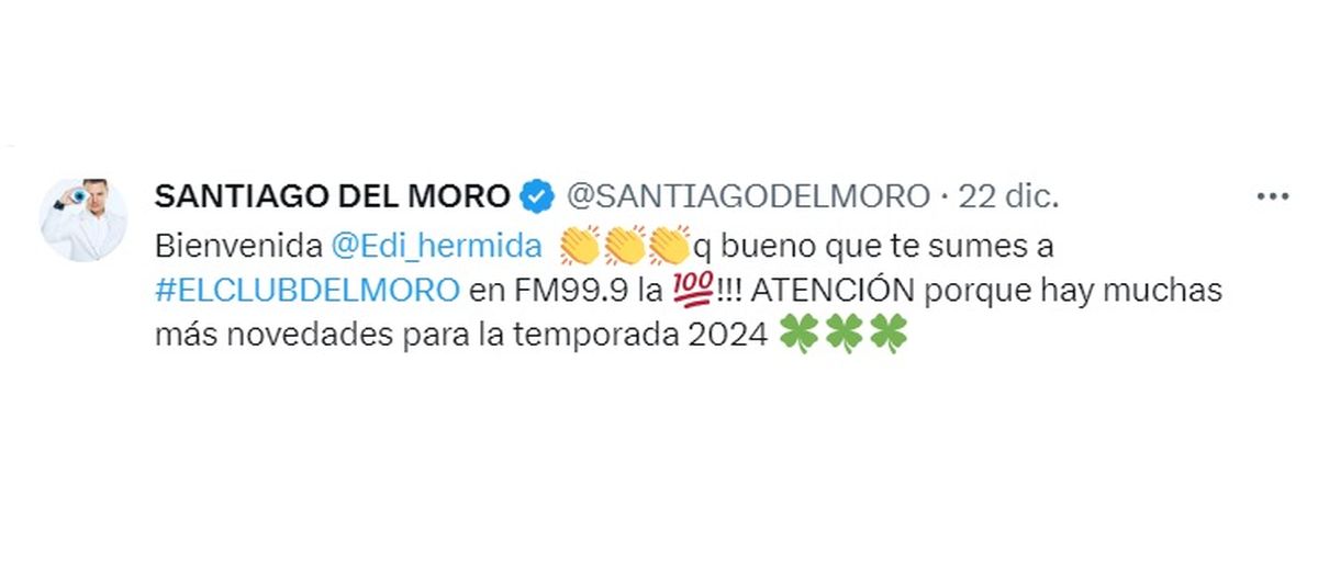 "Bienvenida @Edi_hermida qué bueno que te sumes a #ElclubdelMoro en FM 99.9! Atención porque hay muchas más novedades para la temporada 2024", advertía el conductor.