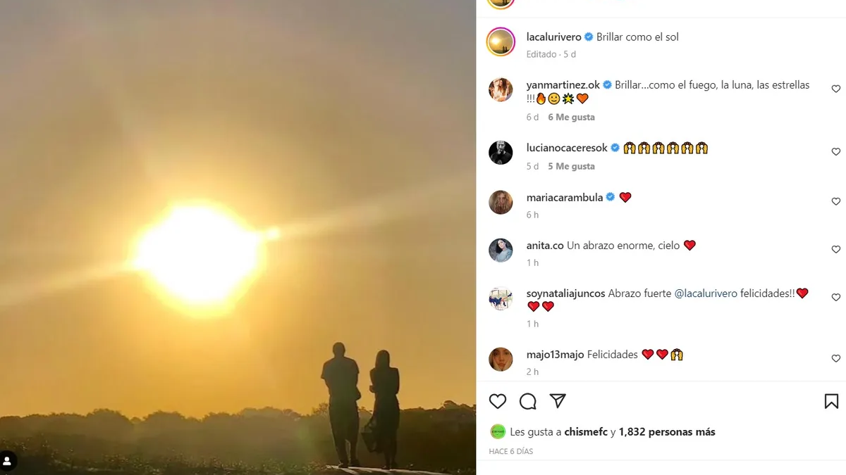 Con una selfie suya, donde se la ve sonriente y con los rayos del sol iluminando su rostro, Rivero se limitó a escribir desde su cuenta de Instagram la palabra "Kairós. Gracias", para confirmar su embarazo.