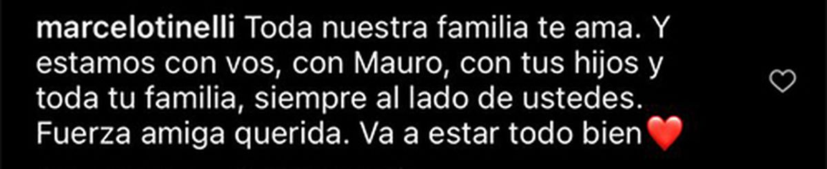 Marcelo Tinelli le escribió un sentido mensaje a la empresaria: “Toda nuestra familia te ama. Y estamos con vos, con Mauro, con tus hijos y toda tu familia, siempre al lado de ustedes. Fuerza amiga querida. Va a estar todo bien”.