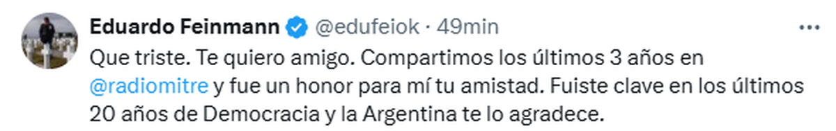 "Que triste. Te quiero amigo. Compartimos los últimos 3 años en @radiomitre y fue un honor para mí tu amistad. Fuiste clave en los últimos 20 años de Democracia y la Argentina te lo agradece", sumó Eduardo Feinmann.