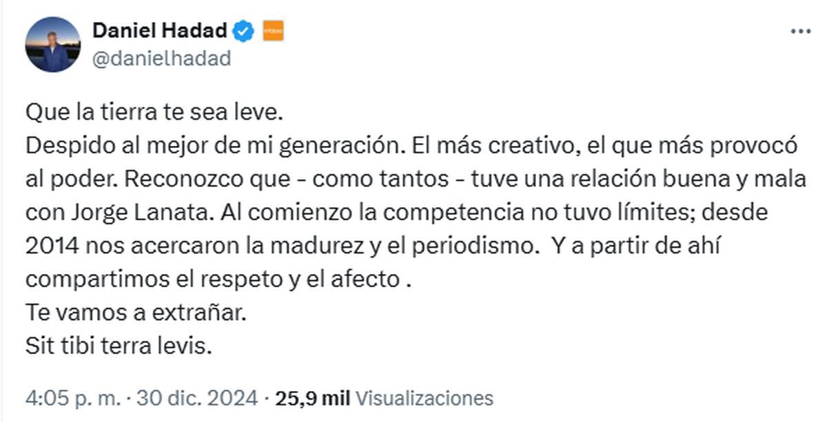 "Que la tierra te sea leve. Despido al mejor de mi generación. El más creativo, el que más provocó al poder. Reconozco que - como tantos - tuve una relación buena y mala con Jorge Lanata. Al comienzo la competencia no tuvo límites; desde 2014 nos acercaron la madurez y el periodismo. Y a partir de ahí compartimos el respeto y el afecto. Te vamos a extrañar", resumió Daniel Hadad.