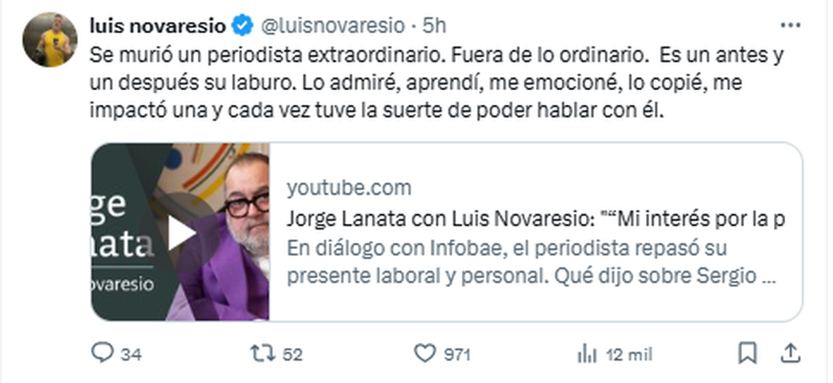 "Se murió un periodista extraordinario. Fuera de lo ordinario. Es un antes y un después su laburo. Lo admiré, aprendí, me emocioné, lo copié, me impactó una y cada vez tuve la suerte de poder hablar con él", reflexionó Luis Novaresio.