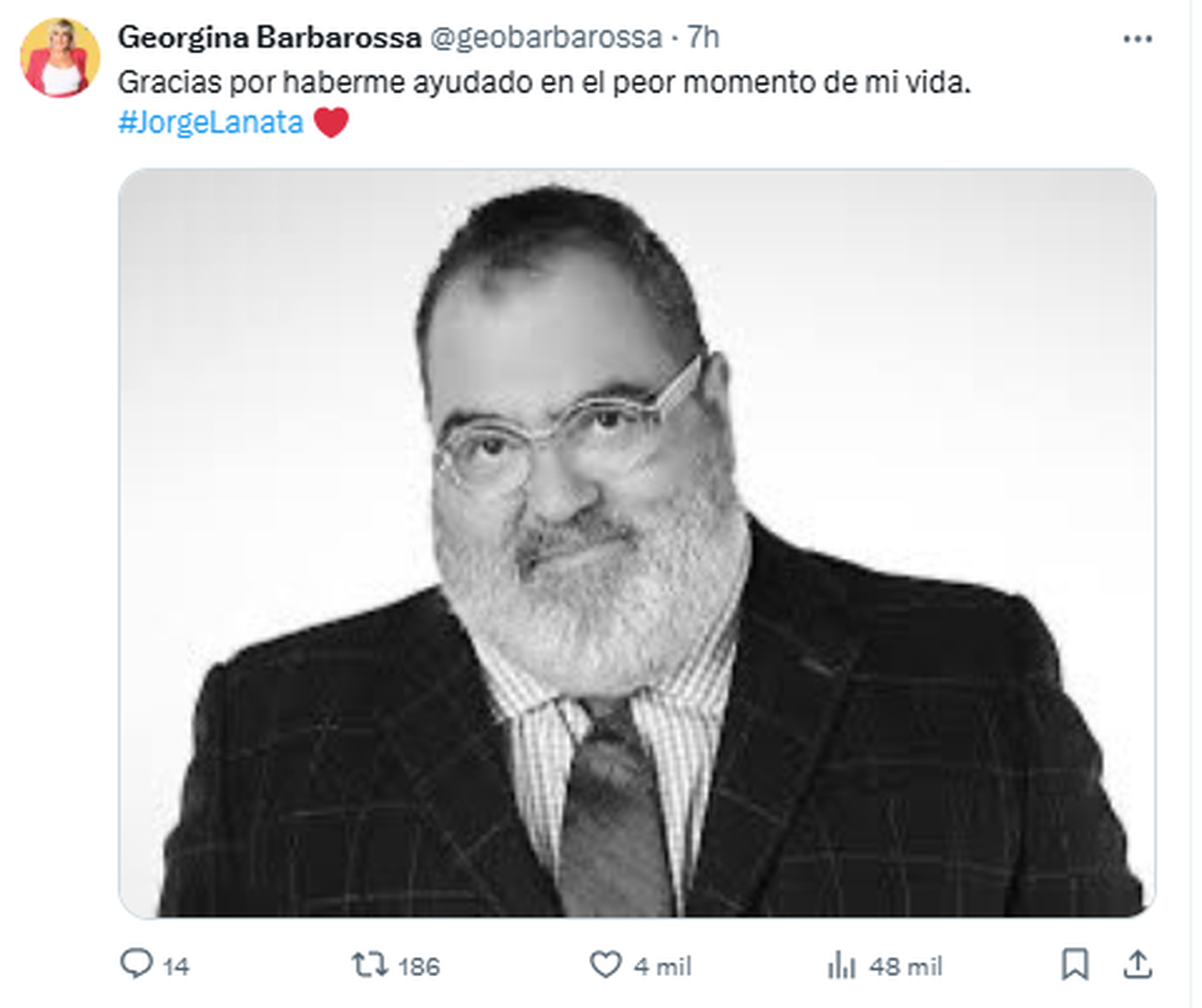 "Gracias por haberme ayudado en el peor momento de mi vida. #JorgeLanata", destacó Georgina Barbarossa.