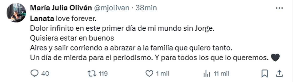 "Lanata love forever. Dolor infinito en este primer día de mi mundo sin Jorge. Quisiera estar en buenos. Aires y salir corriendo a abrazar a la familia que quiero tanto. Un día de mierda para el periodismo. Y para todos los que lo queremos", acotó María Julia Oliván.