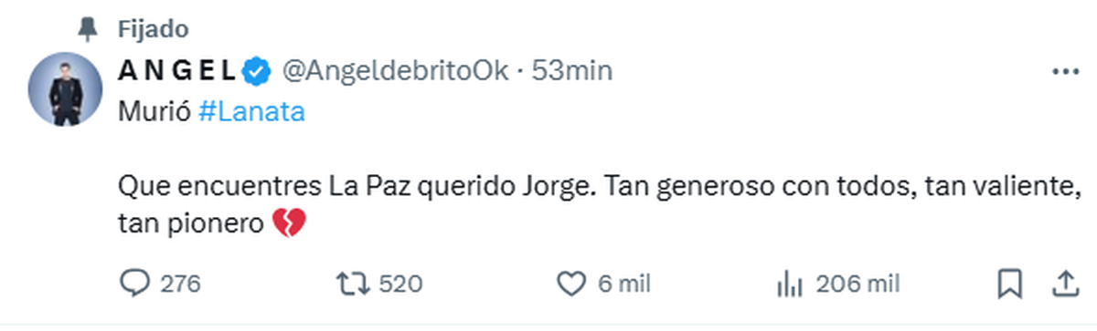 "Murió #Lanata. Que encuentres La Paz querido Jorge. Tan generoso con todos, tan valiente, tan pionero", escribió Ángel de Brito.