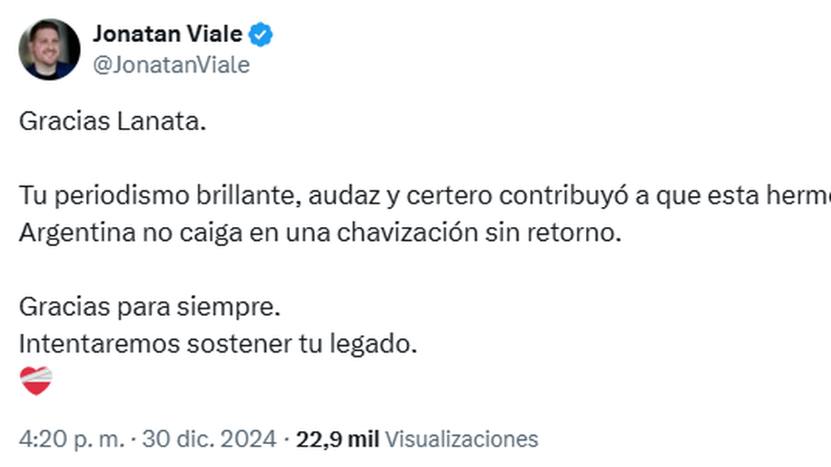 "Gracias Lanata. Tu periodismo brillante, audaz y certero contribuyó a que esta hermosa Argentina no caiga en una chavización sin retorno. Gracias para siempre. Intentaremos sostener tu legado", escribió Jonatan Viale.