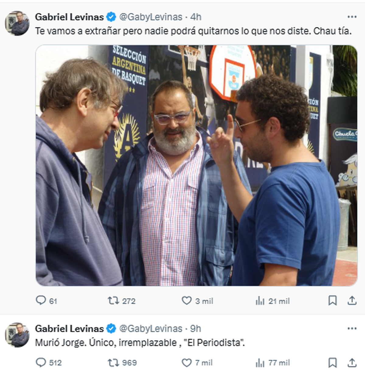 Gabriel Levinas posteó una foto junto a Jorge Lanata y escribió: "Te vamos a extrañar pero nadie podrá quitarnos lo que nos diste. Chau tía".