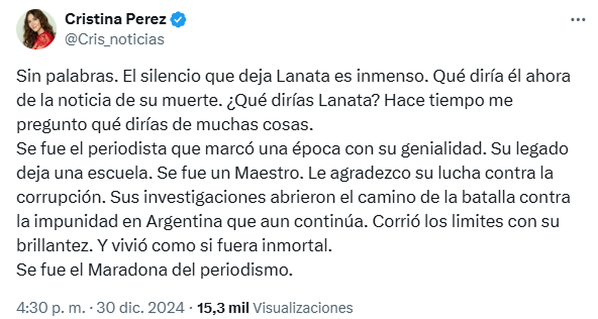 "Sin palabras. El silencio que deja Lanata es inmenso. Qué diría él ahora de la noticia de su muerte. ¿Qué dirías Lanata? Hace tiempo me pregunto qué dirías de muchas cosas. Se fue el periodista que marcó una época con su genialidad. Su legado deja una escuela. Se fue un Maestro. Le agradezco su lucha contra la corrupción. Sus investigaciones abrieron el camino de la batalla contra la impunidad en Argentina que aun continúa. Corrió los limites con su brillantez. Y vivió como si fuera inmortal. Se fue el Maradona del periodismo", publicó Cristina Pérez.