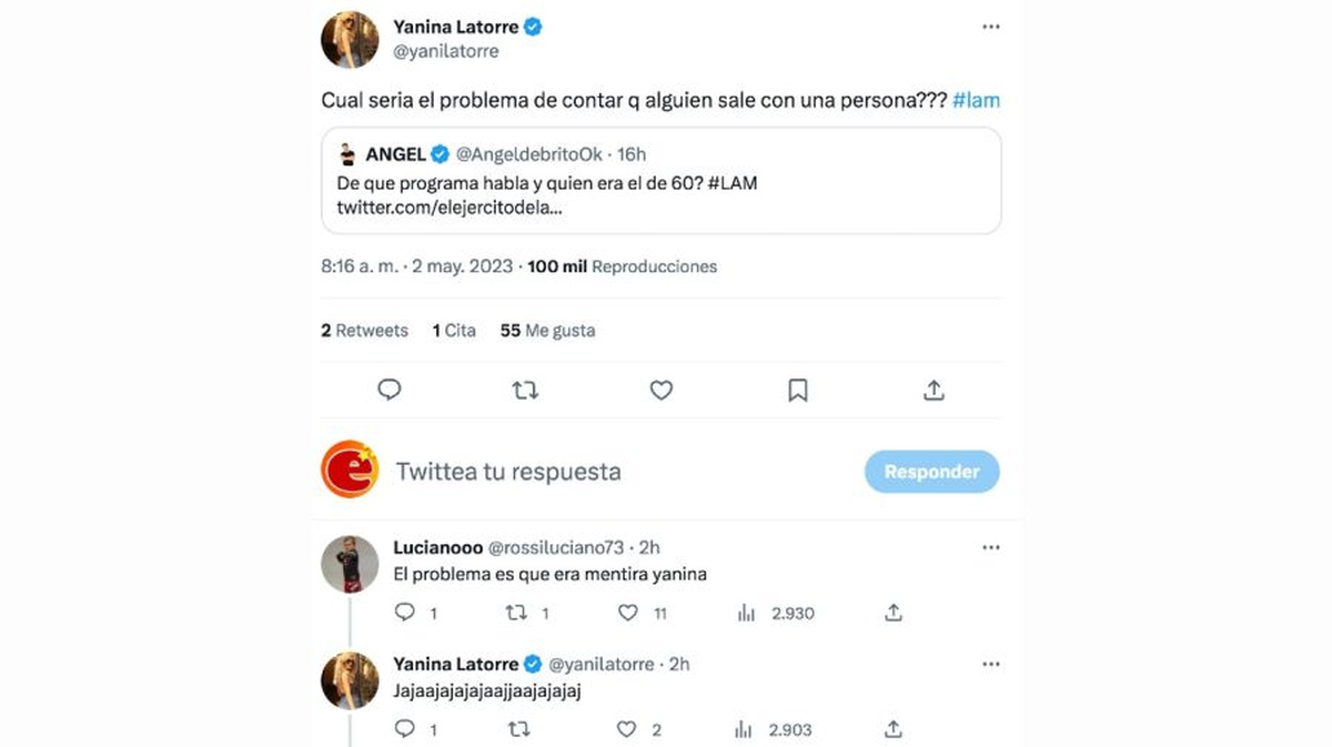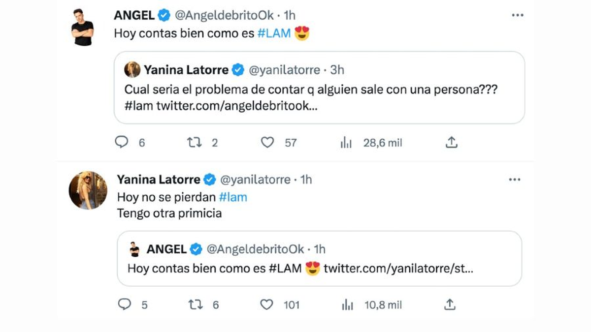 "¿Cuál sería el problema de contar que alguien sale con una persona?", acotó Yanina Latorre en otra publicación. "Hoy contas bien como es #LAM", agregó el periodista. "Hoy no se pierdan #LAM. Tengo otra primicia", prometió la angelita.