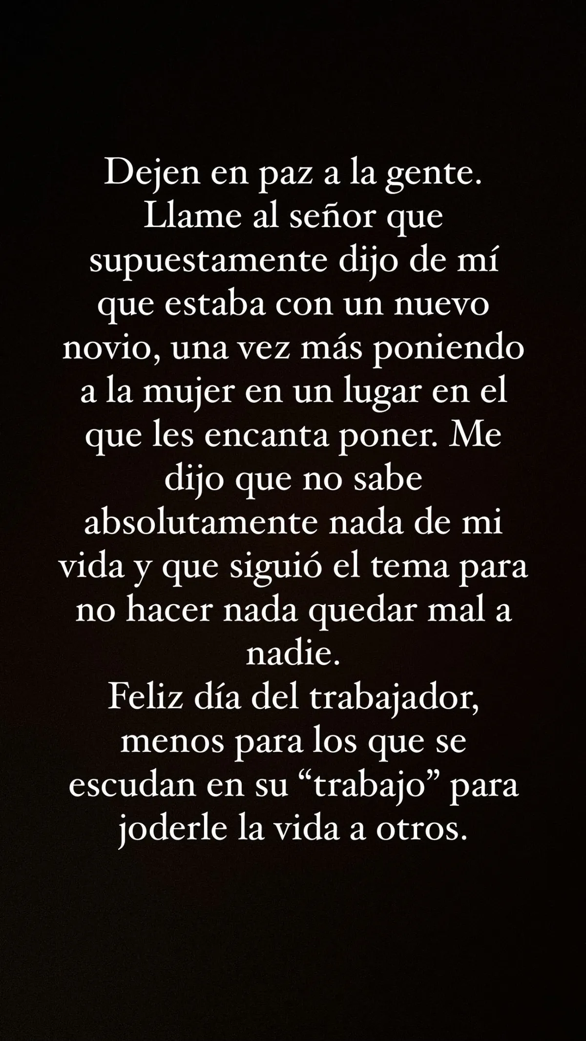La ex de Rusherking dijo que habló con el exrepresentante de futbolistas para que le dé una explicación por sus dichos. "Dejen en paz a la gente. Llamé al señor que supuestamente dijo de mí que estaba con un nuevo novio, una vez más poniendo a la mujer en un lugar en el que les encanta poner. Me dijo que no sabe absolutamente nada de mi vida y que siguió el tema para no hacer quedar mal a nadie. Feliz día del trabajador, menos para los que se escudan en su 'trabajo' para joderle la vida a otros", escribió la China Suárez en una de las historias de Instagram.
