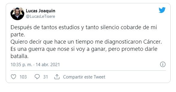 "Después de tantos estudios y tanto silencio cobarde de mi parte. Quiero decir que hace un tiempo me diagnosticaron cáncer. Es una guerra que no sé si voy a ganar, pero prometo darle batalla", dijo Lucas.