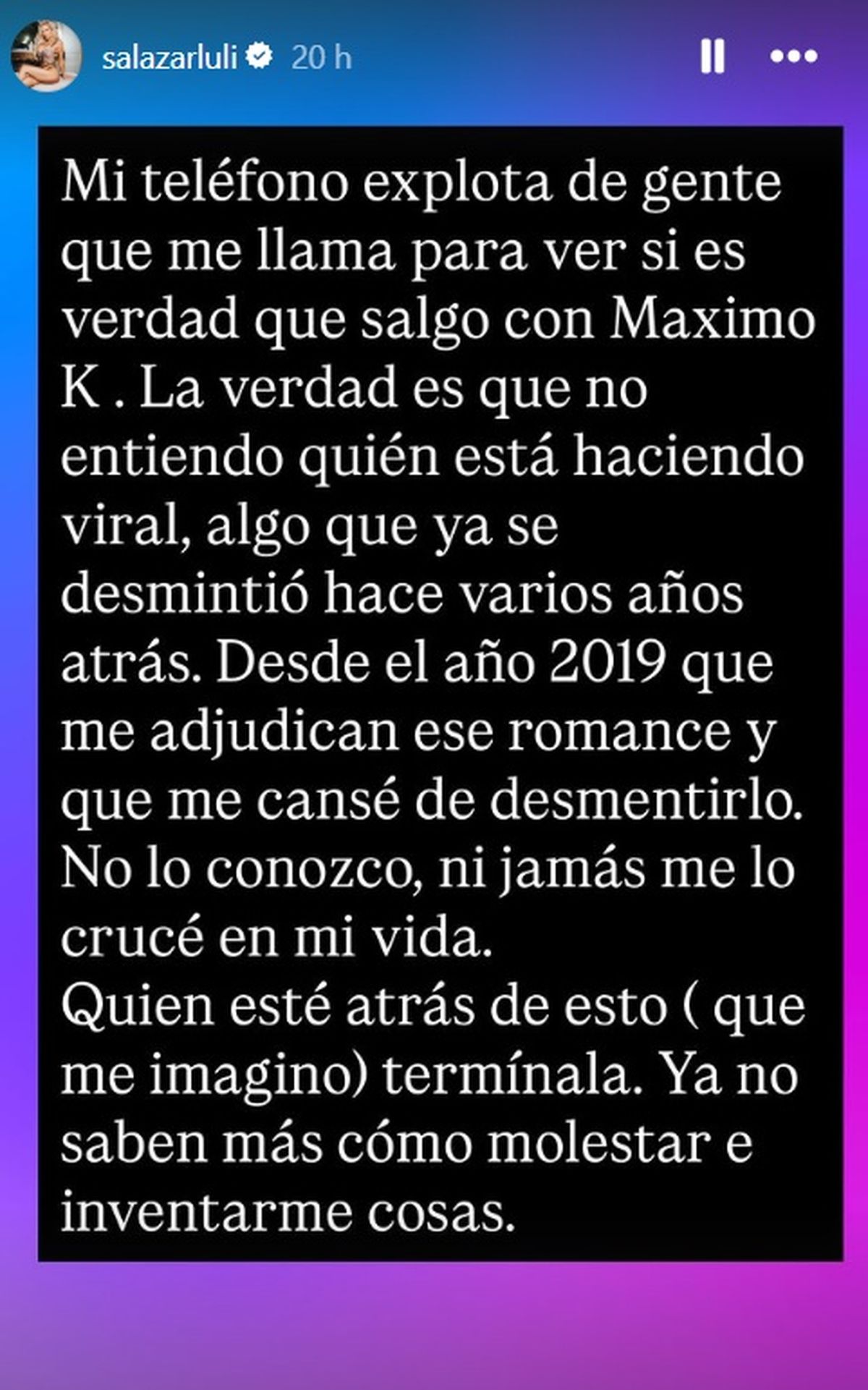 “Mi teléfono explota de gente que me llama para ver si es verdad que salgo con Máximo K”, comenzó Luli su mensaje desde las historias de Instagram.