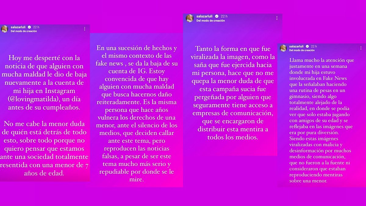 "Hoy me desperté con la noticia de que alguien con mucha maldad le dio de baja nuevamente la cuenta de Instagram a Matilda, un día antes de su cumpleaños. No me cabe la menor duda de quién está detrás de todo esto", comenzó diciendo.