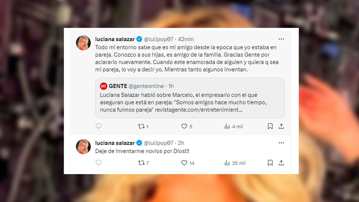En su cuenta de Twitter, Luciana Salazar desmintió vínculo sentimental con Marcelo Aun y fue contundente. "Todo mi entorno sabe que es mi amigo desde la época que yo estaba en pareja. Conozco a sus hijas, es amigo de la familia. Cuando este enamorada de alguien y quiera q sea mi pareja, lo voy a decir yo. Mientras tanto algunos inventan", aclaró.