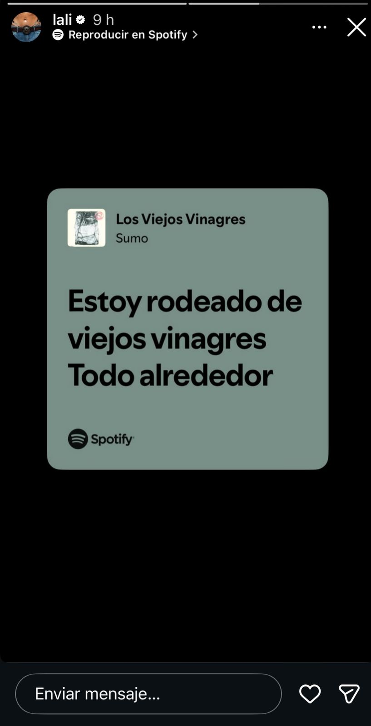 Así, Lali Espósito no hizo más que invitar a sus más de 12 millones de seguidores de Instagram a escuchar en la plataforma musical Spotify la polémica canción: "Estoy rodeado de viejos vinagres, todo alredor".